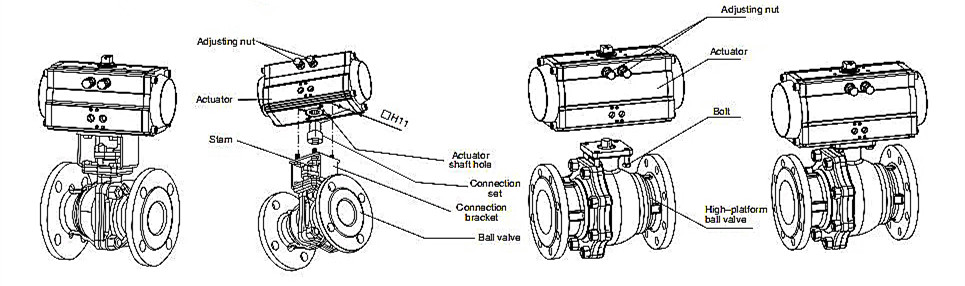 Normalmente, el montaje del actuador y la válvula de bola se realiza mediante un soporte y un juego de conexión. Alternativamente, se pueden ensamblar insertando el vástago especial en el orificio del eje del actuador neumático. Asegúrese de que la punta del husillo no se extienda fuera del orificio del eje del actuador, ya que esto puede causar un mal funcionamiento debido a un atasco. Todas las piezas de conexión deben tener una alta precisión de montaje; de lo contrario, los cambios en el ángulo de apertura o cierre pueden provocar fugas en la válvula. La tolerancia de montaje de las piezas debe cumplir con las normas pertinentes. La tolerancia para la punta del husillo del orificio del eje (vástago), el orificio cuadrado y la ranura es H11/d11, con paralelismo y simetría con una tolerancia geométrica de grado 9.